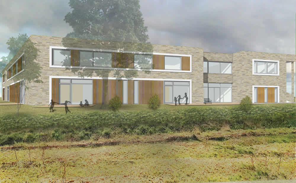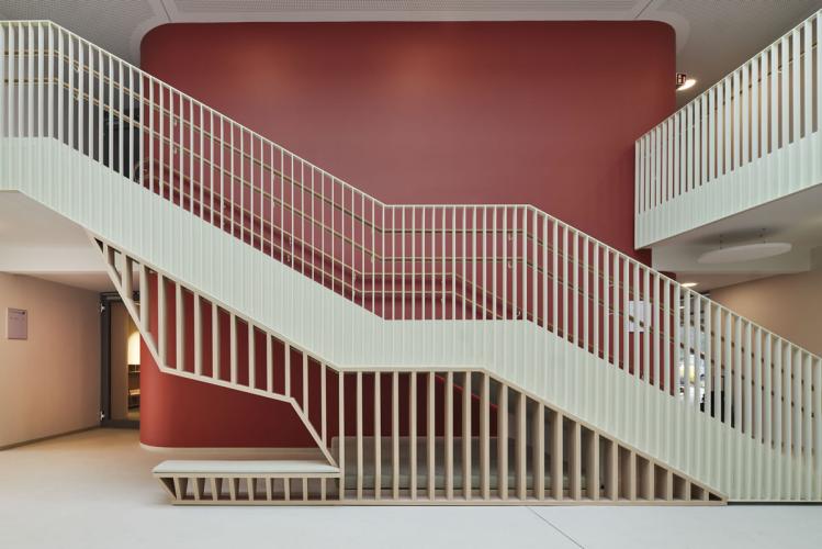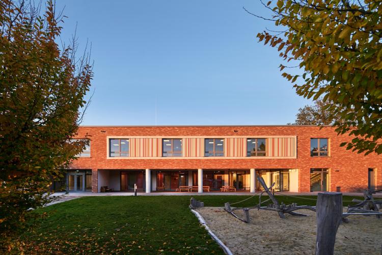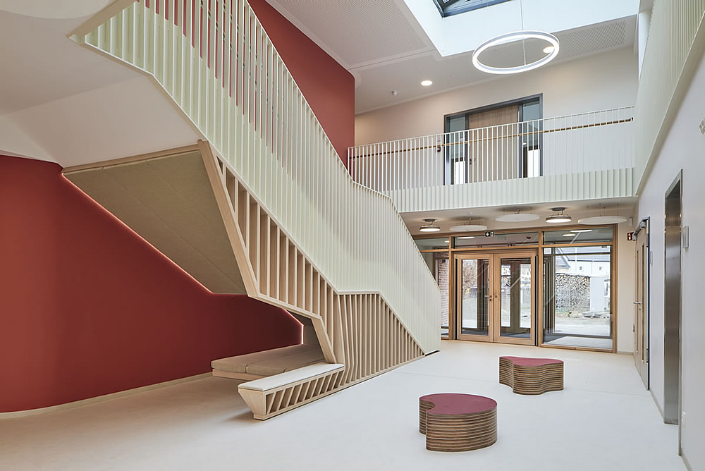 Mit den großformatigen Verglasungen und Rücksprüngen verzahnt sich der Neubau einerseits mit dem Freigelände und fügt andererseits die hochwertigen Ausblicke in den Landschaftsraum als Bestandteil der Grundkonzeption in den Entwurf ein. Im Innenraum erzeugen die hohen Tageslichtanteile und schönen Ausblicke im Zusammenspiel mit den warmen Farbtönen der Oberflächen und den handwerklichen Einbauten für eine heitere und angenehme Atmosphäre, die den passenden Rahmen für einen abwechslungsreichen Kitalltag darstellt. Die Fassade wird als WDVS-Fassade mit Steinbekleidung und farbigen Fassadenanteilen geplant.