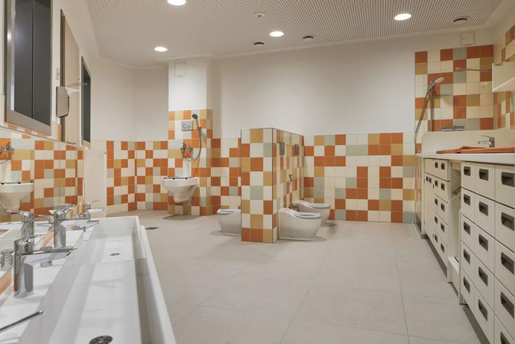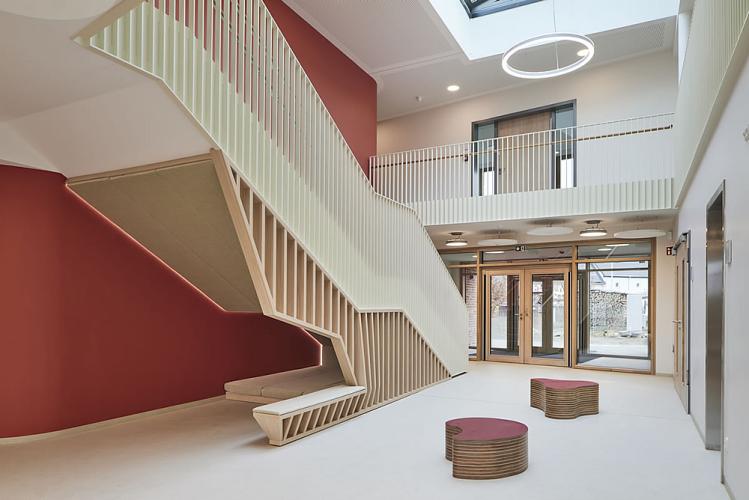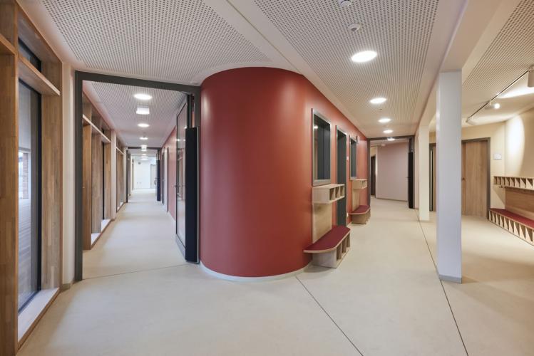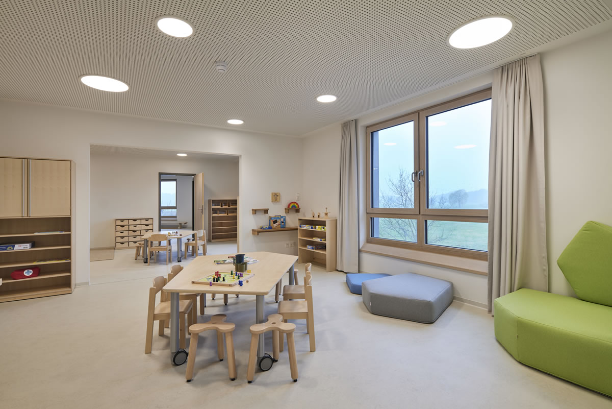 Das Obergeschoss erreichen die Kinder und Eltern über die zentrale einläufige Treppe in der Halle oder den seitlich angeordneten behindertengerechten Aufzug. Der Kindergartenbereich gliedert sich gemäß den Vorgaben des pädagogischen Konzeptes in drei Einheiten, welche jeweils aus drei Gruppenräumen mit zugeordnetem Sanitärbereich und eigener Garderobe bestehen. Zusätzlich stehen drei Projekträume zur wechselnden Benutzung zur Verfügung.