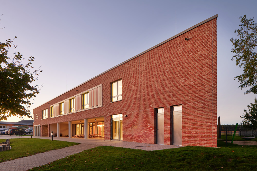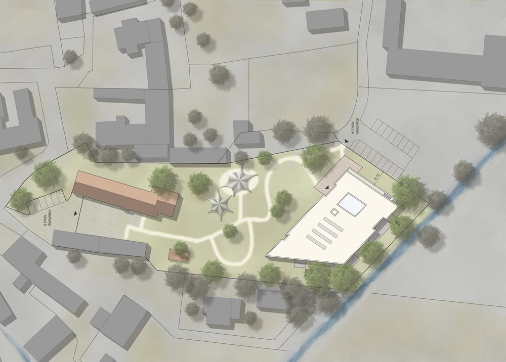 Aufbauend auf einer städtebaulichen Standortuntersuchung wird der Kindergartenneubau am südlichen Grundstücksende des Bestandsgrundstücks als verzogenes Rechteck in Anlehnung an den Grundstückszuschnitt entworfen. Neben der vorteilhaften Ausbildung eines kompakten Baukörpers mit schöner Blickbeziehung in den freien Landschaftsraum bildet sich zwischen dem Neubau und dem Bestandsgebäude ein zusammenhängender Freibereich aus. Die notwendigen PKW-Stellplätze werden daher außerhalb des Grundstücks auf den Flächen des gemeindeeigenen Bauhofes angeordnet.