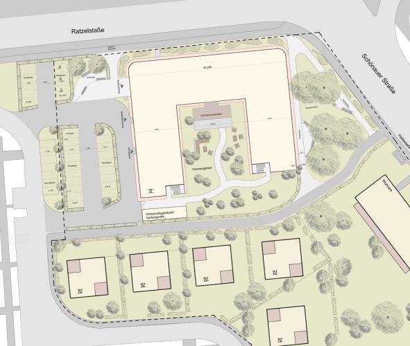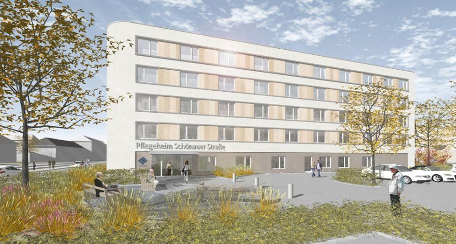 Der Neubau des Pflegeheimes für ca. 132 Bewohner nimmt als Auftakt des Stadtteils Schönau auf dem großen brachliegenden Grundstück an der Straßenkreuzung Schönauer Straße / Rätzelstraße eine wichtige städtebauliche Funktion ein. Daher wurde das Bauvorhaben in enger Abstimmung zwischen dem Stadtplanungsamt Leipzig und dem zukünftigen Betreiber entwickelt, um sowohl die städtebaulichen Anforderungen als auch die funktionalen Anforderungen zu erfüllen. Der Baukörper schirmt mit seiner U-Form den Straßenlärm ab und bildet im Innenhof einen besonnten, landschaftsplanerisch gestalteten Freiraum aus, der den Bewohnern zur Verfügung steht. Gleichzeitig steht der Baukörper als Auftakt einer neuen Wohnanlage aus Stadthäusern, die sich südlich des Pflegeheimes entwickeln wird. Entlang der Schönauer Straße entsteht im Osten vor dem Baukörper ein baumbestandener Platz, der vorhandenen Baumbestand erhält und ergänzt. Die Erschließung erfolgt im Westen über den Haupteingang mit dem vorgelagerten Parkplatz.