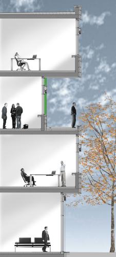 Der chinesisch-belgische Hersteller von LKW Auflegern CIMC Silvergreen GmbH realisierte auf dem neuen Produktionsgelände in Günzburg den Neubau eines energieeffizienten Verwaltungsgebäudes. Die in zwei Richtungen gegeneinander verschobenen Obergeschosse bilden in den einzelnen Ebenen vorgelagerte Terrassen und Loggien aus, die den Mitarbeitern als Freiräume zur Verfügung stehen. Die Büros werden in der Raumtiefe zusätzlich über einen separaten, umlaufenden Oberlichtstreifen belichtet. Neben den transparenten Verwaltungseinheiten im Obergeschoss, verfügt der mit einer Metallfassade bekleidete Baukörper im Erdgeschoss über einen großzügigen Empfangsbereich mit Cafeteria und Außenterrasse.Aufbauend auf dem hohen Umweltanspruch der CIMC Silvergreen GmbH wurde der fünfgeschossige Stahlbetonbau mit Betonkernaktivierung, Wärmepumpe mit Erdsonden, Deckenheizung und kontrollierter Lüftungsanlage ausgestattet. Die ENEV 2014 wurde zusätzlich um 15% unterschritten.