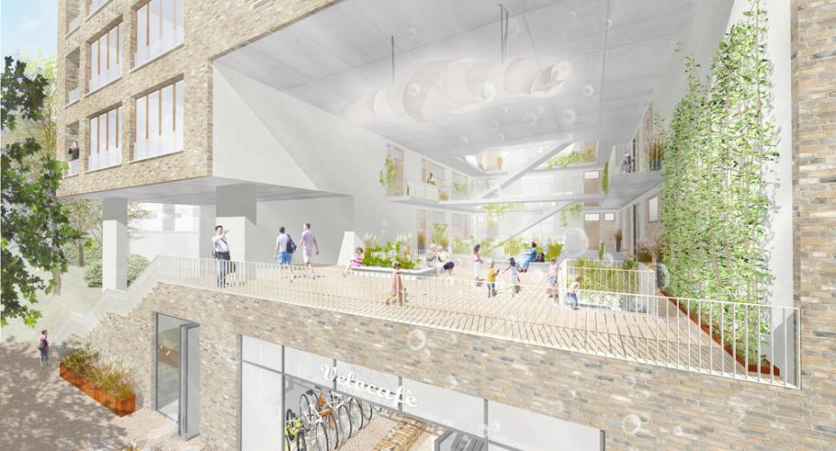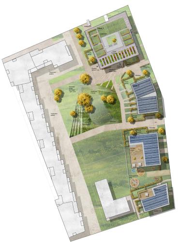 Die Stadt München projektiert in Freiham einen neuen, hinsichtlich der geplanten Wohnqualitäten, der Ökologie, Mobilität und Nachhaltigkeit vorbildhaften Stadtteil für insgesamt mehr als 20.000 Bewohner mit konzeptionellem Mietwohnungsbau. Grundlage unseres Entwurfes für das Baufeld WA 11.1 mit vier Wohnhäusern über einem gemeinsamen Untergeschoss ist die intensive städtebauliche Analyse des vorgegebenen Baufeldes sowie die Auseinandersetzung mit den Rahmenparametern zum städtebaulichen Gesamtkonzept, zum Raumprogramm, zur Architektur sowie zur notwendigen Wirtschaftlichkeit der Gesamtanlage. Aufbauend auf der im B-Plan vorgegeben städtebaulichen Position der vier unterschiedlichen Punkthäuser bildet unser Entwurfsvorschlag ein Gesamtensemble aus, das durch den Auftakt des prägnanten Atriumhauses im Norden bestimmt wird. Das Atriumhaus orientiert sich mit seiner großzügigen Öffnung und der Freitreppe sowie den Gemeinschaftsräumen zu dem landschaftsplanerisch gestalteten Innenhof und bietet den Bewohnern der Gesamtanlage damit Raum für gemeinsame Aktivitäten und Veranstaltungen unterschiedlichster Art. Es bildet mit seiner Klinkerriemchenfassade und den eingeschnittenen Loggien den Kopf der gesamten Anlage aus. Die sich anschließenden Häuser 2-4 übernehmen im Erdgeschoss dieses Material und stellen damit trotz der geometrischen Abweichungen und Unterschiedlichkeiten den Gesamtzusammenhang der Anlage her. Belebendes Element der Anlage wird die zweigeschossige Kita in Haus 3. Alle Wohnungen erhalten zur Sicherstellung unwiderruflicher Wohnqualitäten französische Fenster und eine Loggia. Die Dachterrassen der Häuser 1,3 und 4 stehen analog zu dem Innenhof den Bewohnern als intensiv begrünte Gemeinschaftsflächen zur Verfügung. Im Zusammenspiel mit diesen anspruchsvollen Freianlagen entsteht ein Objekt, das im Dialog mit seiner Umgebung steht, dem qualitativ hochwertigen und anspruchsvollen Vorgaben gerecht wird und gleichzeitig eine langfristige, wirtschaftlich erfolgreiche Vermietung und Betreibung sicherstellt. Der Entwurf wurde durch den Gestaltungsbeirat der Stadt München freigegeben.