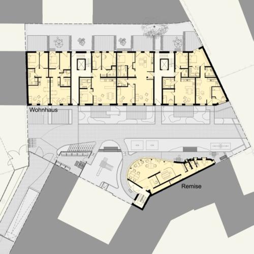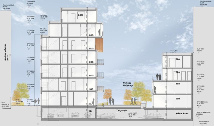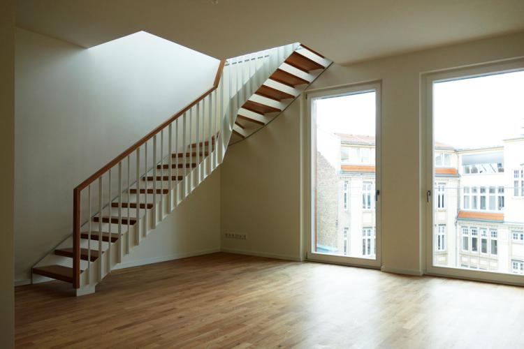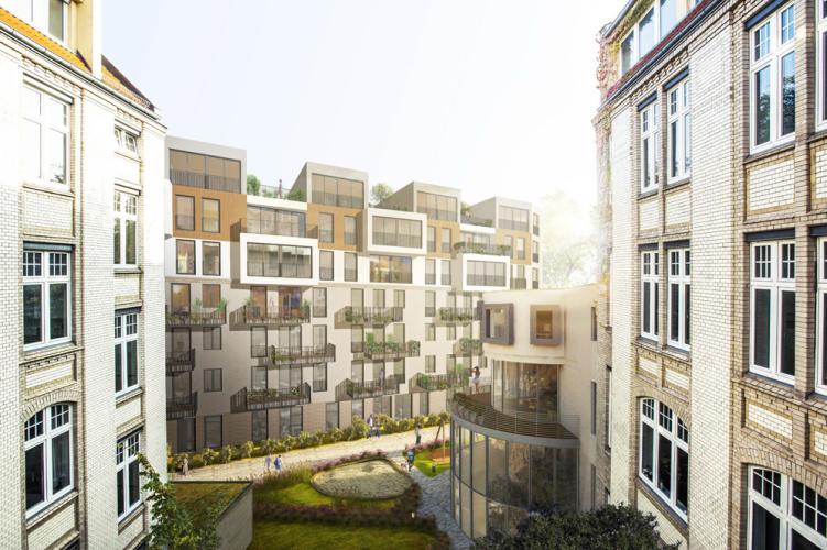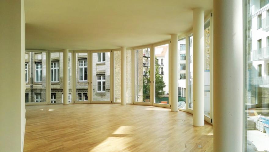In einer gewachsenen sonnigen Hinterhofsituation im pulsierenden Stadtteil Berlin Mitte, wurde auf der Grundfläche eines ehemaligen Produktionsgebäudes ein 7-geschossiger Neubau mit 37 hochwertig ausgestatteten, unterschiedlich großen Wohnungen sowie ein gegenüberliegendes Remisengebäude errichtet. Aufbauend auf dem steigenden Bedürfnis im Herzen der Stadt zu wohnen, vereint der Neubau lichtdurchflutete moderne Wohnungen mit grünen, landschaftsplanerisch geprägten Außenräumen und Freianlagen. Die gegliederte Fassade des Hauptbaukörpers und der gegenüberliegenden Remise prägen die Stimmung und das Lebensgefühl in dem sorgfältig gestalteten Innenhof. Alle Wohnungen verfügen über eine Raumhöhe von 2,85 m und besitzen einen Balkon oder eine Terrasse. Die Wohnungsgrundrisse weisen flexible großzügige offene Wohnbereiche mit integrierten Küchen auf. Die hochwertigen, sorgsam ausgesuchten Materialien im Innenausbau, wie z.B. Eichenparkett und großformatige sandfarbene Fliesen, unterstützen mit den französischen Holzfenstern den großzügigen Raumeindruck.